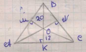 В прямоугольном треугольнике \(MOB\) (где \(O\) — центр вписанной окружности, \(OM=12\) — радиус, \(OB=20\)), по теореме Пифагора: \(MB=\sqrt{OB^{2}-OM^{2}}=\sqrt{20^{2}-12^{2}}=\sqrt{400-144}=16\) см. Это высота и медиана к основанию равнобедренного треугольника, значит \(BV=BM=16\) см.