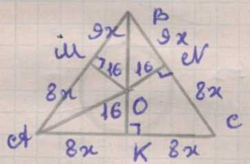 Из отношения \(8:9\) и свойства равнобедренного треугольника следует равенство высоты-медианы-биссектрисы, откуда по пропорции \( \frac{17x}{x}=\frac{8x}{16} \) получаем \(x=34\).