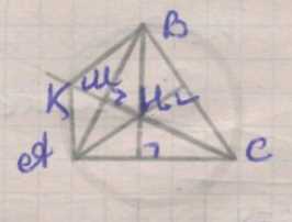 2. Докажем, что \(AB\) делит отрезок \(HK\) пополам. Так как \(K\) — отражение \(H\) относительно \(AB\), выполняется равенство \(AH = AK\) по симметрии, а также \(BH = BK\). Более того, отражение относительно прямой \(AB\) переводит лучи, перпендикулярные \(AB\), в себя, поэтому \(AB \perp HK\). При отражении расстояния до прямой \(AB\) сохраняются: проекции точек \(H\) и \(K\) на \(AB\) совпадают. Следовательно, середина отрезка \(HK\) лежит на \(AB\). Формально, если \(M\) — точка пересечения \(AB\) с серединным перпендикуляром к \(HK\), то из симметрии относительно \(AB\) получаем \(MH = MK\), то есть \(M\) — середина \(HK\), а \(M \in AB\).