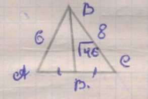 Рассмотрим треугольник со сторонами \(6\), \(8\) и неизвестной стороной \(x\). По условию медиана, проведённая к стороне \(x\), имеет длину \(\sqrt{46}\). Напомним формулу длины медианы к стороне \(x\): если две другие стороны равны \(a\) и \(b\), то длина медианы выражается как \(m_x=\frac{1}{2}\sqrt{2(a^{2}+b^{2})-x^{2}}\). В нашем случае \(a=6\), \(b=8\), поэтому \(m_x=\frac{1}{2}\sqrt{2(6^{2}+8^{2})-x^{2}}\). Подставляя \(m_x=\sqrt{46}\), получаем уравнение \(\sqrt{46}=\frac{1}{2}\sqrt{2(6^{2}+8^{2})-x^{2}}\).