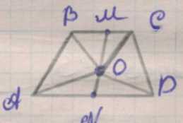 Рассмотрим трапецию \(ABCD\) с основаниями \(AB\parallel CD\). Пусть \(M\) и \(N\) — середины оснований \(AB\) и \(CD\) соответственно, а \(MN\) — отрезок, соединяющий середины оснований. Точка \(O\) лежит на \(MN\). Соединим \(O\) с вершинами \(A,B,C,D\). Нас интересуют треугольники, прилежащие к боковым сторонам, то есть \( \triangle ABO \) и \( \triangle CDO \). Заметим, что \(M\in AB\) и \(N\in CD\), причём \(AM=MB=\frac12 AB\) и \(CN=ND=\frac12 CD\). Так как \(MN\) — средняя линия трапеции, она параллельна основаниям, а расстояния между прямыми, параллельными основаниям, одинаковы. Отсюда высоты из точек \(A\) и \(C\) к прямой \(MN\) равны, как и высоты из \(B\) и \(D\) к \(MN\).
