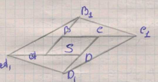 Следовательно, стороны параллелограмма \(A_1B_1C_1D_1\) задаются векторами \(2\vec a\) и \(2\vec b\), его площадь равна \( |(2\vec a)\times(2\vec b)|=4|\vec a\times\vec b|=4S \).