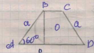 Площадь трапеции: \(S=\frac{(BC+AD)\cdot h}{2}=\frac{2a\cdot \frac{a\sqrt{3}}{2}}{2}=\frac{a^{2}\sqrt{3}}{2}\).