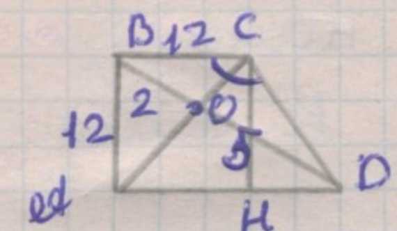 Меньшая боковая сторона — \(AB=h=12\). Тогда периметр \(P=AB+BC+CD+AD=12+12+12\sqrt{2}+24=48+12\sqrt{2}\). Но по условию другая диагональ делит меньшую диагональ в отношении \(5:2\), считая от острого угла, то есть нужно понять, что меньшая диагональ — \(AC\), а делит её \(BD\) с \(AE:EC=5:2\). Аналогично получаем \(B=\frac{5}{3}h\), \(BC=\frac{2}{3}h\), \(CD=h\sqrt{2}\), что при \(h=12\) даёт \(P=48\)см.
