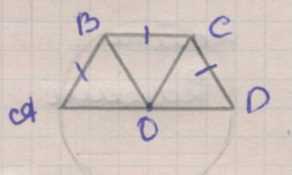 1. Рассмотрим равнобедренную трапецию с основаниями: большее основание проходит через центр описанной окружности. Если центр окружности лежит на большем основании, то радиусы к вершинам, лежащим на окружности, дают равенства длин: \(OB=BC=CD\). Это означает, что от точки на меньшем основании (центральная вершина соединений) проведены равные отрезки к вершинам верхнего основания и к двум точкам на большем основании, образуя три равнобедренных треугольника \(OBD\), \(BOC\) и \(COD\). В каждом из них боковые стороны равны радиусу, а общая вершина соединений расположена на меньшем основании, поэтому углы при этой вершине в сумме вокруг точки дают полный угол \(360^\circ\).
