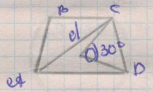 Трапеция \(ABCD\) вписана в окружность, значит она равнобочная и диагонали равны: \(AC=BD=d\). Центральный угол \(\angle COD=30^\circ\) опирается на дугу \(CD\); соответствующий вписанный угол \(\angle CAD=15^\circ\).