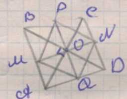 1. Пусть \(ABCD\) — выпуклый четырёхугольник. Обозначим середины противоположных сторон: \(M\) и \(N\) — середины \(AB\) и \(CD\), а \(P\) и \(Q\) — середины \(BC\) и \(AD\). Возьмём \(A\) за начало координат и введём векторы \(\vec a=\overrightarrow{AB}\) и \(\vec b=\overrightarrow{AD}\). Тогда вершины имеют координаты \(A=\vec 0\), \(B=\vec a\), \(D=\vec b\), \(C=\vec a+\vec b\). По определению середины отрезка получаем координаты точек: \(M=\frac12\vec a\), \(N=\frac12(\vec a+2\vec b)\), \(P=\frac12(2\vec a+\vec b)\), \(Q=\frac12\vec b\). Эти выражения следуют из усреднения соответствующих пар вершин, например, \(N=\frac{C+D}{2}=\frac{(\vec a+\vec b)+\vec b}{2}\), а \(P=\frac{B+C}{2}=\frac{\vec a+(\vec a+\vec b)}{2}\).