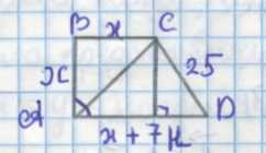 Тогда меньшее основание \(ВС = 24\), а большее \(СD = 24 + 7 = 31\).