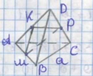 2) Теперь вычислим скалярное произведение векторов \(\overrightarrow{MK}\) и \(\overrightarrow{DA}\). Точки \(M\) и \(K\) — середины рёбер \(AB\) и \(AD\) соответственно, поэтому длины отрезков \(AM\) и \(AK\) равны \(\frac{a}{2}\). Вектор \(\overrightarrow{MK}\) можно представить как разность векторов \(\overrightarrow{AK} — \overrightarrow{AM}\). Длина вектора \(\overrightarrow{MK}\) равна \(\frac{a}{2}\), а угол между \(\overrightarrow{MK}\) и \(\overrightarrow{DA}\) такой же, как между рёбрами, то есть \(120^\circ\). Тогда скалярное произведение равно \( \frac{a}{2} \cdot a \cdot \cos 120^\circ = \frac{a^2}{2} \cdot \left(-\frac{1}{2}\right) = -\frac{a^2}{4} \).