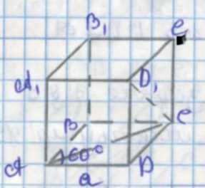 Далее рассмотрим вектор \( \overrightarrow{CD_1} \), который равен \( 2a \) по длине. Для вычисления скалярного произведения двух векторов \( \overrightarrow{AC} \) и \( \overrightarrow{CD_1} \) используем формулу: \( \overrightarrow{AC} \cdot \overrightarrow{CD_1} = |\overrightarrow{AC}| \cdot |\overrightarrow{CD_1}| \cdot \cos \theta \), где \( \theta \) — угол между этими векторами. В условии указан угол \( 120^\circ \), поэтому подставляем значения: \( 2a \) для длины \( \overrightarrow{AC} \), \( 2a \) для длины \( \overrightarrow{CD_1} \) и \( \cos 120^\circ = -\frac{1}{2} \). Таким образом, получаем: \( \overrightarrow{AC} \cdot \overrightarrow{CD_1} = 2a \cdot 2a \cdot \left(-\frac{1}{2}\right) = 4a^2 \cdot \left(-\frac{1}{2}\right) = -2a^2 \). В исходном тексте ошибка в значении косинуса: указано \( -\frac{3}{2} \), что невозможно, так как косинус не может быть меньше -1. Правильное значение — \( -\frac{1}{2} \).