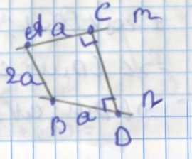 2. По условию, длины отрезков \( AC \) и \( BD \) равны \( a \), а отрезок \( AB = 2a \). Угол между прямыми \( m \) и \( n \), а значит и между векторами \( \overrightarrow{AC} \) и \( \overrightarrow{DB} \), равен 60° или 120°. Это важно для вычисления скалярного произведения векторов \( \overrightarrow{AC} \) и \( \overrightarrow{DB} \). Используем формулу для квадрата суммы векторов: \( (\overrightarrow{AC} + \overrightarrow{CD} + \overrightarrow{DB})^2 = |\overrightarrow{AC}|^2 + |\overrightarrow{CD}|^2 + |\overrightarrow{DB}|^2 + 2(\overrightarrow{AC} \cdot \overrightarrow{CD}) +\)