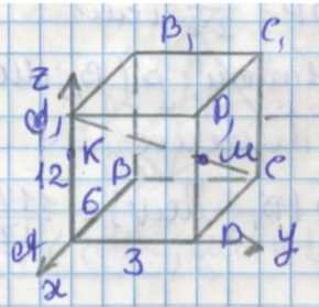 Рассмотрим прямоугольный параллелепипед (или прямоугольную призму), вершины которого заданы координатами \(A(0,0,0)\), \(B(6,0,0)\), \(D(0,3,0)\), \(A_1(0,0,12)\). Точка \(C\) как вершина основания определяется как сумма векторов \(\overrightarrow{AB}\) и \(\overrightarrow{AD}\) от точки \(A\), поэтому её координаты равны \(C(6,3,0)\). Диагональ боковой грани \(CA_1\) соединяет точки \(C(6,3,0)\) и \(A_1(0,0,12)\). Точка \(M\) делит отрезок \(CA_1\) в отношении \(1:2\), считая от \(C\), то есть \(CM:MA_1=1:2\). По формуле деления отрезка в заданном отношении получаем координаты точки \(M\): \(M=\left(\frac{2\cdot 6+1\cdot 0}{3},\;\frac{2\cdot 3+1\cdot 0}{3},\;\frac{2\cdot 0+1\cdot 12}{3}\right)=(4,2,4)\). Вектор направления от \(C\) к \(A_1\) равен \(\overrightarrow{CA_1}=A_1-C=(0-6,\;0-3,\;12-0)=(-6,-3,12)\). Этот вектор задаёт нормаль искомой плоскости \(\alpha\), поскольку \(\alpha\) перпендикулярна отрезку \(CA_1\).