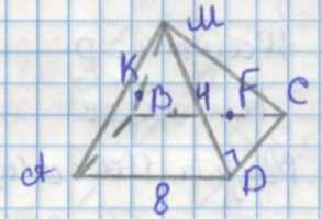Диагональ квадрата \(BD\) вычисляется по формуле \(BD = 8\sqrt{2}\) см, так как диагональ квадрата равна стороне, умноженной на \(\sqrt{2}\). Тогда длина ребра \(MB\) равна \(MB = \sqrt{MD^2 + BD^2} = \sqrt{4^2 + (8\sqrt{2})^2} = \sqrt{16 + 128} = \sqrt{144} = 12\) см. Точка \(K\) делит ребро \(MB\) в отношении \(3:1\), считая от точки \(M\), значит \(MK = \frac{3}{4} \times 12 = 9\) см.