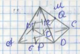 Далее, рассмотрим плоскость \(\alpha\), которая проходит через середину ребра \(AD\), середину ребра \(MC\) и центр масс треугольника \(AMB\). Середина ребра \(AD\) — это точка \(P\) с координатами \(P\left(\frac{0+0}{2}; \frac{0+6}{2}; \frac{0+0}{2}\right) = (0;3;0)\). Середина ребра \(MC\) — точка \(Q\) с координатами \(Q\left(\frac{6+6}{2}; \frac{6+6}{2}; \frac{0+12}{2}\right) = (6;6;6)\). Центр масс треугольника \(AMB\) вычисляется как среднее арифметическое координат его вершин: \(A(0;0;0)\), \(M(6;6;12)\), \(B(6;0;0)\). Тогда центр масс \(O\) будет \(O\left(\frac{0+6+6}{3}; \frac{0+6+0}{3}; \frac{0+12+0}{3}\right) = (4;2;4)\).