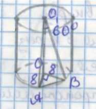 1. Рассмотрим треугольник \( \triangle AOB \), где \( AO \) и \( OB \) — радиусы основания цилиндра, равные 8 см. Из условия задачи хорда \( AB \) видна из центра основания под углом \( 90^\circ \), значит треугольник \( \triangle AOB \) прямоугольный с прямым углом при вершине \( O \). По теореме Пифагора вычисляем длину хорды \( AB \) как гипотенузу: