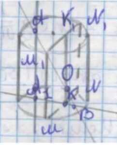Так как сечение параллельно оси, то его пересечение с прямой \(AB\) будет точкой, где \(AB\) пересекает боковую поверхность цилиндра между основаниями. Это точка, у которой координата по оси высоты цилиндра совпадает с соответствующей координатой точек \(M, M_1, N, N_1\) (т.е. лежит в плоскости сечения).