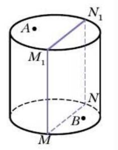 Проведём через точки \(A\) и \(B\) прямую \(AB\). Из условия точки \(A\) и \(B\) лежат на противоположных основаниях цилиндра, а плоскость \(MM_1N_1\) параллельна оси цилиндра и проходит через боковую поверхность.