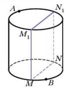 Рассмотрим цилиндр с основанием, на котором расположены точки \(A\) и \(B\). Через эти точки проведём прямые, параллельные оси цилиндра, которые пересекут противоположное основание в точках \(M_1\) и \(N_1\) соответственно. Пусть плоскость \(MM_1N_1\) проходит через точки \(M\), \(M_1\) и \(N_1\). Прямая \(AB\) соединяет точки \(A\) и \(B\), лежащие на одном основании цилиндра.