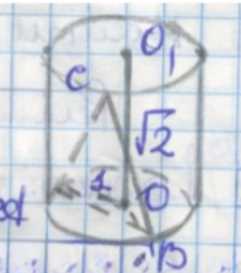 Радиус основания цилиндра \(R = 1\), высота \(h = \sqrt{2}\). Вершины \(A\) и \(B\) лежат на окружности одного основания, а вершина \(C\) — на окружности другого основания. Расстояние между основаниями равно \(h = \sqrt{2}\).