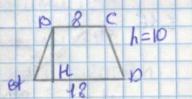 1) В основании призмы лежит равнобокая трапеция с основаниями \(8\) и \(18\). Вписанный в призму цилиндр касается боковых граней, поэтому его ось параллельна высоте призмы, а диаметр равен высоте трапеции. В равнобокой трапеции боковые стороны равны, обозначим их длину как \(AD=BC\). Чтобы найти высоту, рассмотрим проекцию большей основы на меньшую: половина разности оснований даёт горизонтальный сдвиг одного катета прямоугольного треугольника у боковой стороны. Так как \(18-8=10\), то половина этой разности равна \(5\), следовательно отрезок у основания, образующий катет, равен \(5\).
