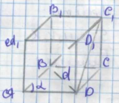 1. Основание призмы — ромб \(ABCD\) с острым углом \(A = \alpha\) и диагональю \(BD = d\). Цилиндр, вписанный в призму, касается всех боковых граней, а его основание лежит в плоскости ромба. Диаметр цилиндра равен диагонали \(BD\), то есть \(d\). Радиус цилиндра равен \(\frac{d}{2}\).