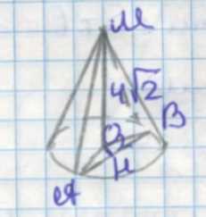 1. Пусть \(MO\) — высота конуса, проведённая из вершины \(M\) к центру основания \(O\). По условию, \(MO = 4\sqrt{2}\) см. Отрезки \(MA\) и \(MB\) — образующие конуса, и они равны, так как треугольник \(AMB\) равнобедренный. Также известно, что расстояние от точки \(O\) до прямой \(AB\) в основании равно 2 см.