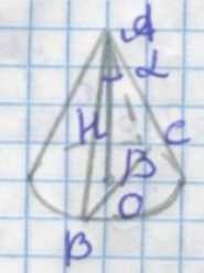 1. Пусть высота конуса равна \(H\), угол между двумя образующими — \(\alpha\), а угол между плоскостью сечения и основанием конуса — \(\beta\). Сечение проходит через две образующие, между которыми угол \(\alpha\), и наклонено к основанию под углом \(\beta\). Для нахождения площади боковой поверхности такого конуса используется геометрия сечения, учитывающая оба эти угла.