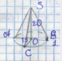 1. Пусть высота конуса равна \(h = 20\) см, а точка \(C\) лежит на окружности основания конуса на расстоянии \(d = 15\) см от диаметра \(AB\). Основание конуса — круг, центр основания \(O\), диаметр \(AB\) проходит через \(O\). Поскольку точка \(C\) удалена от диаметра \(AB\) на \(15\) см, её координаты в декартовой системе, где \(O = (0, 0, 0)\), будут \(C = (15, y, 0)\), где \(y\) определяется из уравнения круга: \(15^{2} + y^{2} = R^{2}\). Вершина конуса \(S\) расположена на высоте, то есть \(S = (0, 0, 20)\).