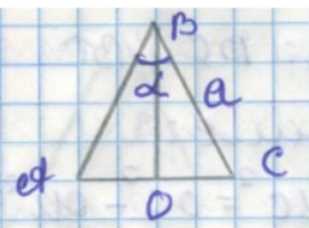 Для вычисления площади боковой поверхности конуса сначала найдём радиус основания. В осевом сечении треугольник делится медианой, и половина основания равна \( OC = a \sin \frac{\alpha}{2} \), поэтому радиус основания \( r = a \sin \frac{\alpha}{2} \). Боковая поверхность конуса — это сектор круга с радиусом равным образующей \(a\), длина дуги основания равна полной окружности основания: \( 2\pi r \). Площадь боковой поверхности выражается как \( S_{\text{бок. п.}} = \pi r l \), где \( l = a \) — образующая, а \( r = a \sin \frac{\alpha}{2} \).
