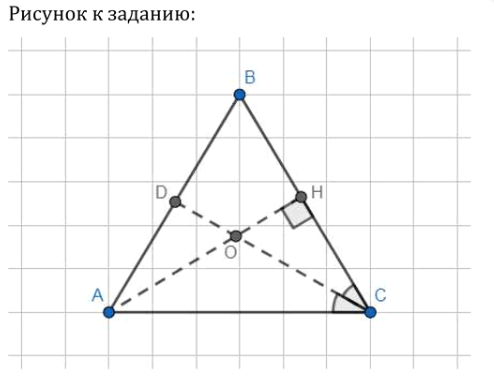 | Дано: ΔABC — равнобедренный; AH — высота; CD — биссектрисса; ∠OCH = 64°; | Решение: 1) В прямоугольном ΔOHC: ∠OCH + ∠OHC = 90°; ∠OHC + 64° = 90°; ∠OHC = 26°; 2) ΔABC равнобедренный: ∠ACB = 2 ∙ ∠ACD = 2 ∙ 26° = 52°; ∠CAB = ∠ACB = 52°; ∠ABC = 180° — 2 ∙ ∠CAB = 76°; |