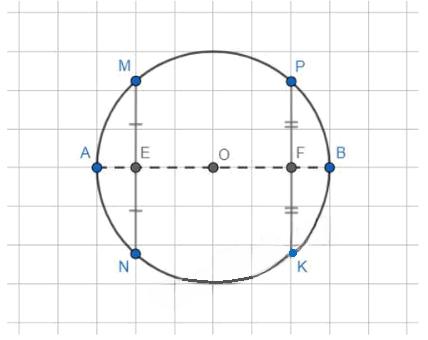 3. Теперь заметим, что диаметр AB является прямой, а точки E и F лежат на нём. Таким образом, EF — это часть диаметра AB. Прямая EF пересекает обе хорды MN и PK под прямыми углами, то есть:
