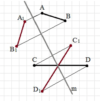 Перерисуйте рисунок 7. Постройте отрезки, симметричные отрезкам АВ и CD относительно прямой m.