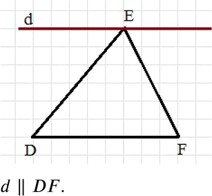 Начертите треугольник DEF и проведите через вершину Е прямую, параллельную противоположной стороне.