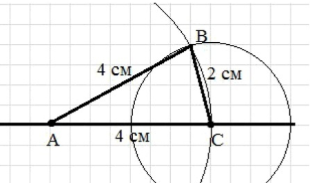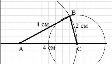 Проведем окружность с радиусом 4 см и с центром в точке А; проведем окружность с радиусом 2 см и с центром в точке С. Обозначим одну из точек пересечения окружностей точкой В. Соединим полученные точки, получим треугольник АВС.