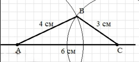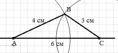 Проведем окружность с радиусом 4 см и с центром в точке А; проведем окружность с радиусом 3 см и с центром в точке С. Обозначим одну из точек пересечения окружностей точкой В. Соединим полученные точки, получим треугольник АВС.