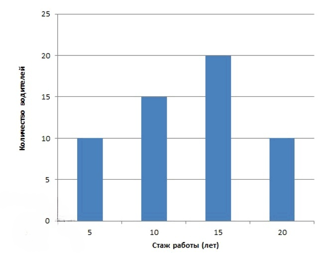 • По оси X — стаж (в годах), по оси Y — количество водителей.