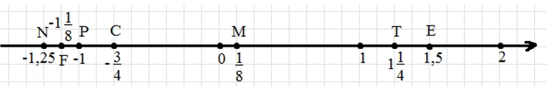 Начертите координатную прямую, взяв за единичный такой отрезок, длина которого в 8 раз больше стороны клетки тетради. Отметьте точки Р (-1), Е (1,5), N (—1,25), M (1/8), T (1 1/4), F (-1 1/8), C (-3/4).