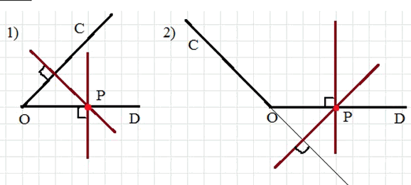 Начертите угол COD, градусная мера которого равна: 1) 46^о; 2) 134^о. Отметьте на луче OD точку Р и проведите через неё прямые, перпендикулярные прямым ОС и OD.