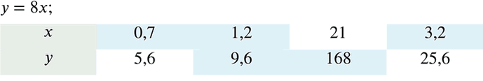 Найдём коэффициент пропорциональности \(k\) по любым данным из таблицы, например, \(x = 0{,}7\), \(y = 5{,}6\):