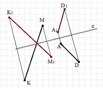 Перечертите рисунок 43. Постройте отрезки, симметричные отрезкам AD и МК относительно прямой с.