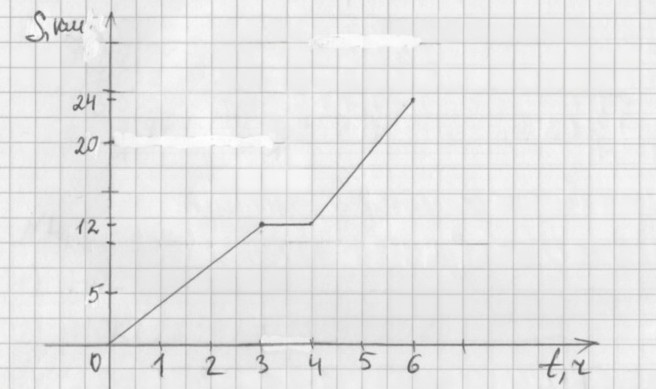Турист вышел из пункта А в пункт В. Сначала он шёл 3 ч со скоростью 4 км/ч, потом 1 ч отдыхал, после чего шёл ещё 2 ч со скоростью 6 км/ч и прибыл в пункт В. Постройте график движения туриста.