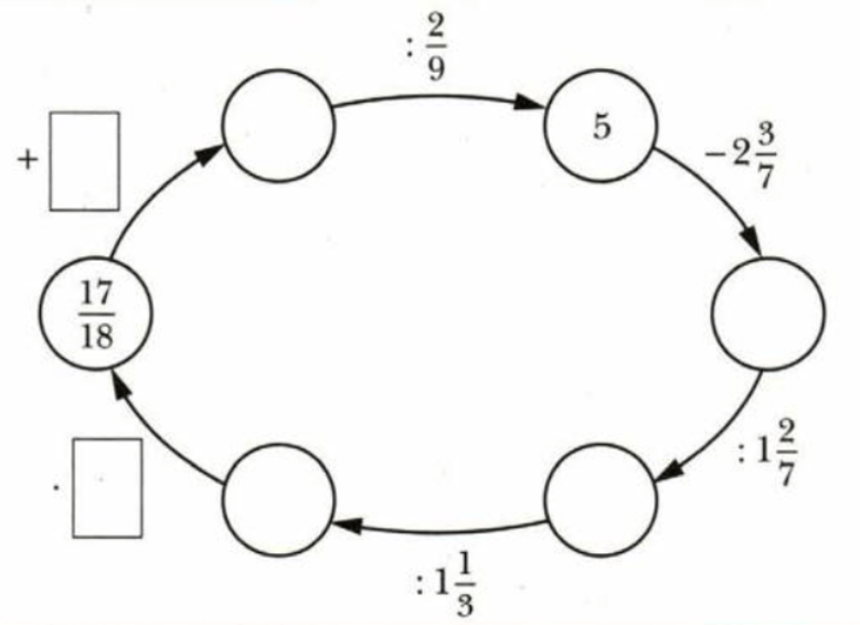1. Преобразуем \( 5 \) в неправильную дробь с общим знаменателем \( 7 \):